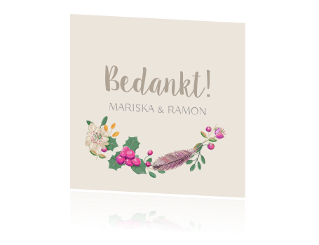 Bedankkaart Bruiloft Met Veren Takjes En Bloemen
