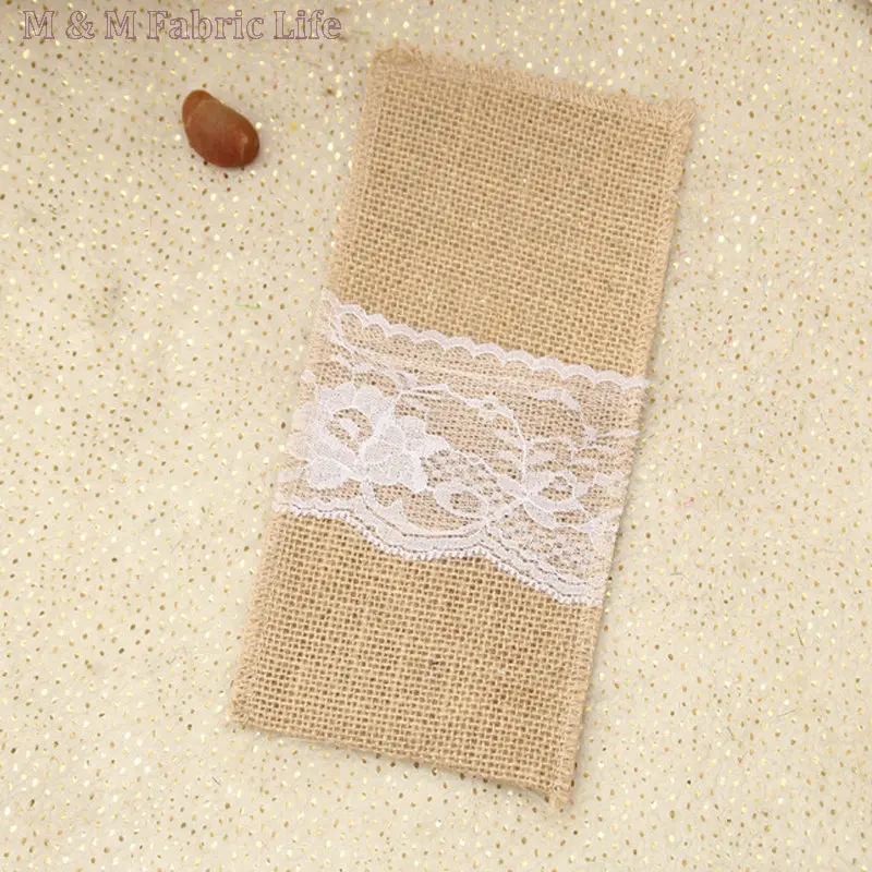 Shabby Chic Rustic Burlap And Lace Silverware Cutlery Holders Set