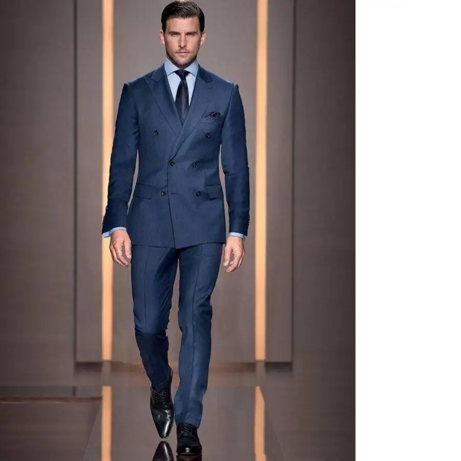 Italiaanse Stijl Navy Blue Bruidegom Tuxedos Double Breasted Slim