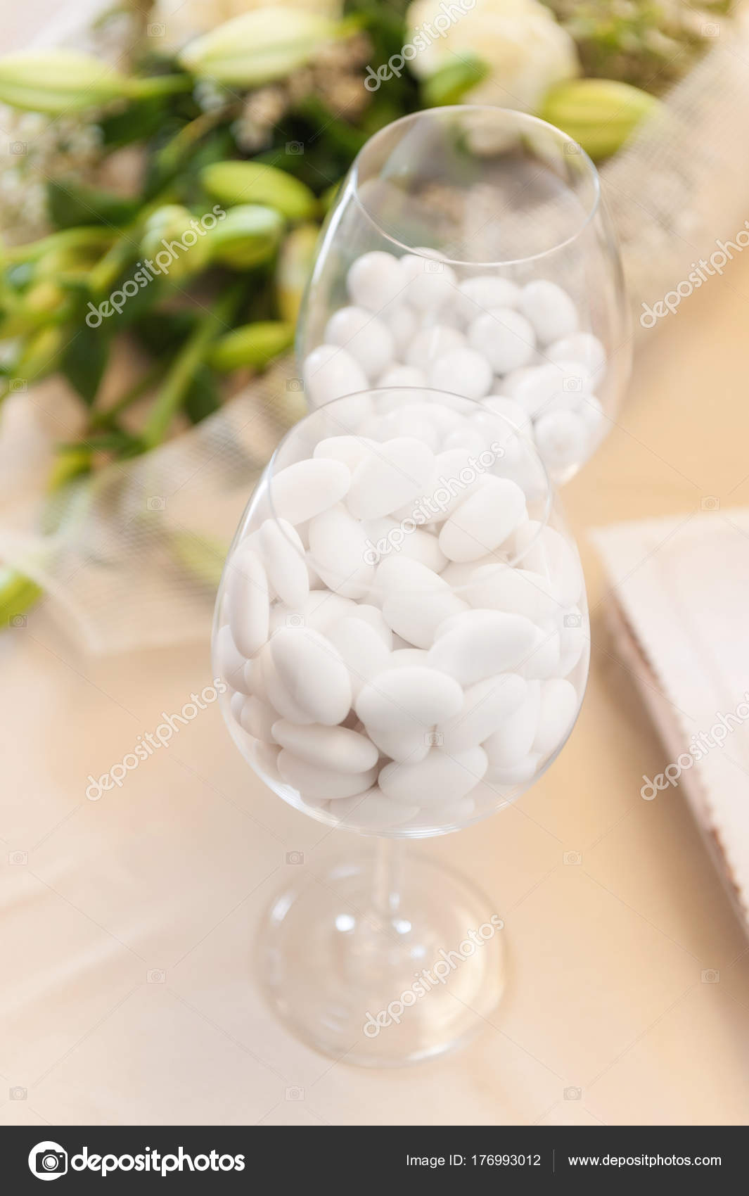 Veel Witte Snoepjes Glazen Containers Bruiloft Stockfoto