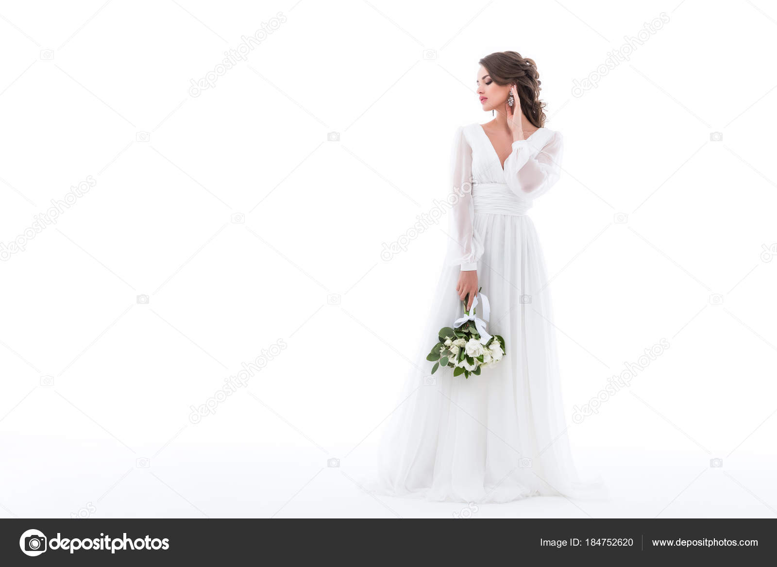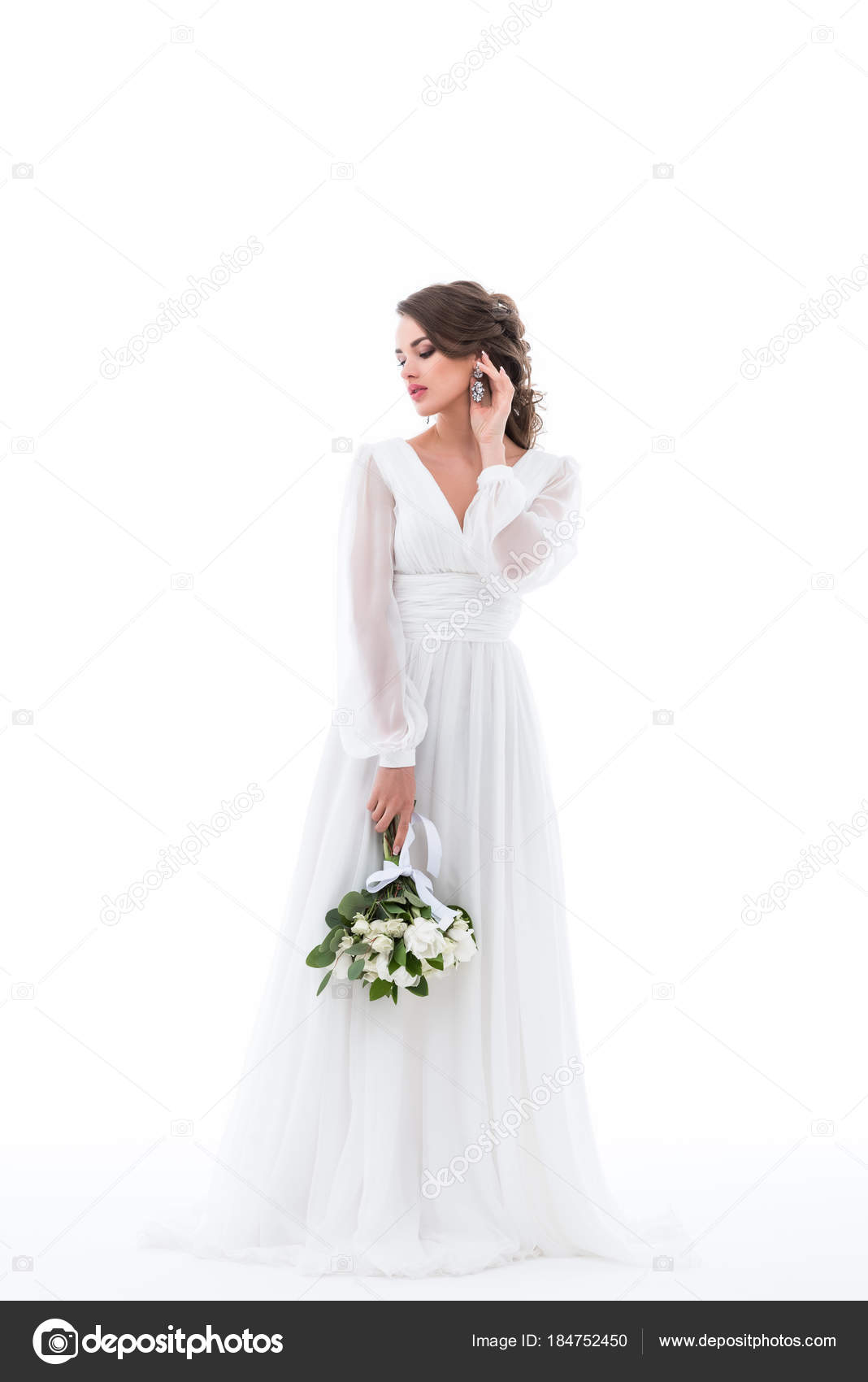 Bruid Poseren Elegante Witte Jurk Met Bruiloft Boeket Geisoleerd