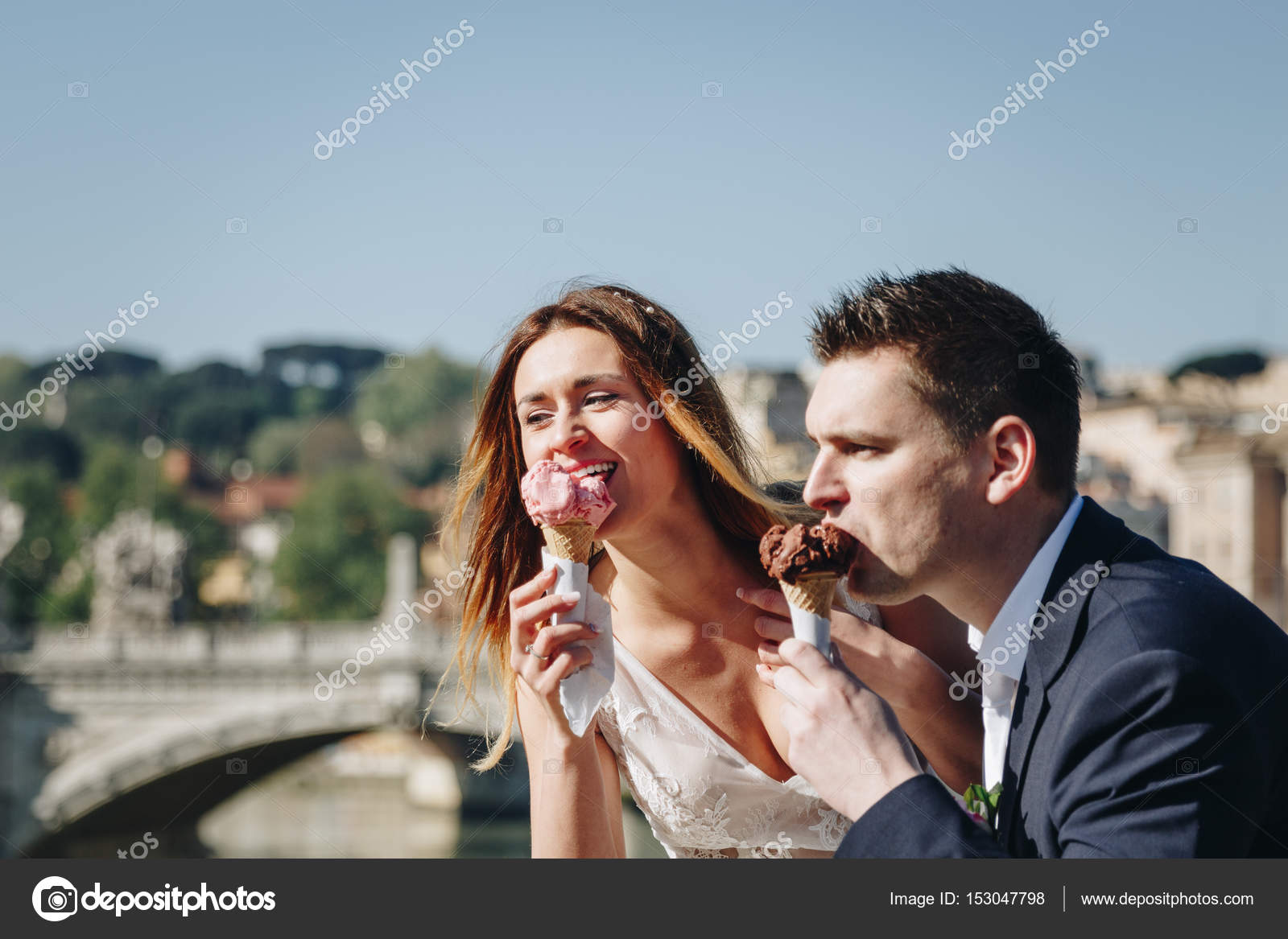 Bruid En Bruidegom Bruiloft Poses Met Consumptie Ijs In Vaticaan