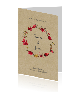Trouwkaart Met Rode Bloemenkrans Voor Herfst Bruiloft