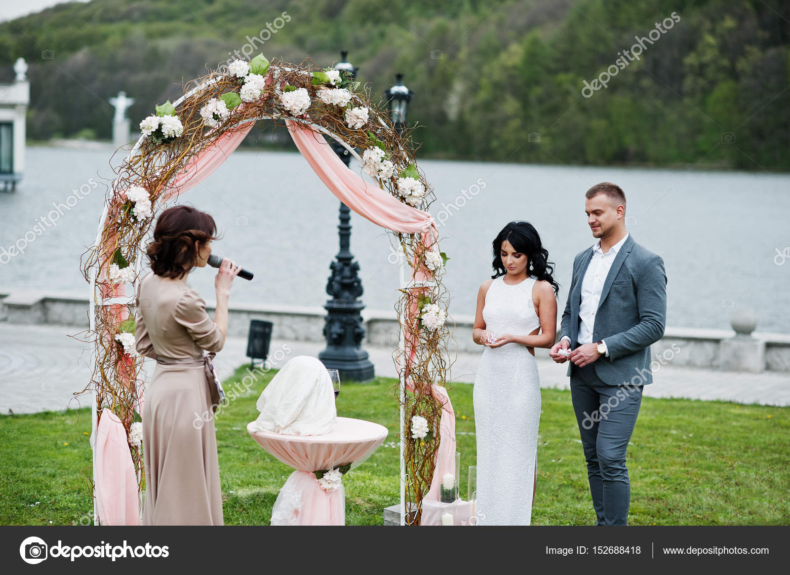 Jonge Modieuze Mooie Paar Met Toespraak Meester Van De Bruiloft